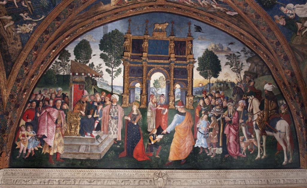 De belangrijkste afbeelding lijkt die van Catharina te zijn: het is een van de twee grote afbeeldingen over de gehele breedte van de zaal, die ook nog eens beter belicht wordt (zie afbeelding hieronder). Bovendien wordt het fresco opgeluisterd door een imposante triomfboog (die met de drievoudige doorgang vooral die van Constantijn in herinnering roept), met een inscriptie PACIS CULTORI, ‘voor de vredesstichter’. (Giorgio Vasari, de kunstenaarsbiograaf, kon deze weergave van architectonische elementen in Pinturicchio’s werk bepaald niet waarderen: de gewoonte om belangrijke architectonische elementen uit te lichten in stucwerk en te vergulden, waardoor de boel uit verhouding raakte, noemde hij ‘ernstige heiligschennis in onze kunst’). Deze titel van vredesstichter verwijst ondubbelzinnig naar Alexander VI, die zichzelf graag zo zag. De combinatie met de boog zorgt dus voor een wonderlijke bilocatie van het afgebeelde: de scène speelt zich af in Egypte, maar wordt voorzien van een Romeins aandoend landschap. Ook de stier die bovenop de boog staat wordt daarmee dubbelzinnig: is het de Apis of de Borgia-stier?