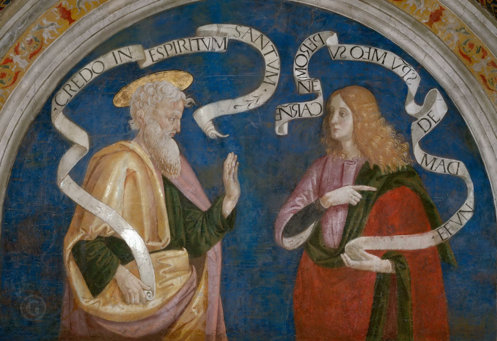 De daarop volgende Sala del Credo (zaal 2 op de plattegrond) lijkt sterk op de vorige, maar dan met niet telkens een profeet en een Sibylle, maar een profeet en een apostel. Niet de Bijbelse en de heidense traditie worden hier naast elkaar gezet, maar de oud- en nieuwtestamentische. De zaal is genoemd naar de tekst die de apostelen uitspreken, het gebed Credo. De profeten hebben nog steeds hun Bijbelteksten (Joël 2:28 in de afbeelding hieronder). Van de daaropvolgende zalen zal ik niet uitgebreid stilstaan bij de Sala delle arti liberali en de Sala dei misteri della fede (resp. zalen 3 en 5 op de plattegrond): de schilderingen, die de zeven vrije kunsten en de belangrijke gebeurtenissen in en om het leven van Jezus weergeven, zijn zonder noemenswaardige problemen te interpreteren, en hun aanwezigheid in pauselijke appartementen is goed te verklaren. Dat geldt minder makkelijk voor de Sala dei Santi (zaal 4 op de plattegrond).