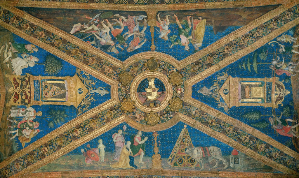 Maar al geven de heiligen op de muur de zaal haar naam, het pièce de résistance is toch het plafond. Het blauw van de achtergrond en het goud van de randen domineren de zaal. De schilderingen zijn onderverdeeld in twee segmenten, die elk weer opgedeeld zijn in vier onderdelen. Afgebeeld is het verhaal van Isis en Osiris zoals we dat bij Diodorus vinden, te beginnen met de noordelijke helft van het plafond. Tussen de twee plafondhelften in bevinden zich nog vijf afbeeldingen die Ovidius’ verhaal over Jupiter en Io illustreren: een verhaal over een rund dat uiteindelijk in Egypte belandt en de godin Isis wordt.